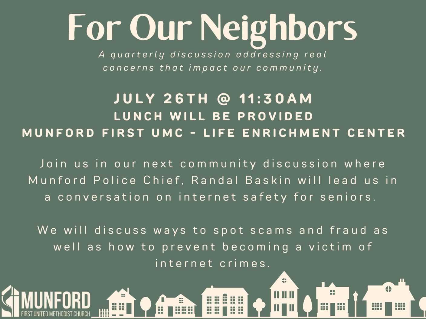 For Our Neighbors - Internet Safety for Seniors Wednesday, July 26, 2023 11:30 AM 2:00 PM Munford First United Methodist Church 57 South Tipton Street Munford, TN 38058 United States (map) Google Calendar ICS Join us for our second For Our Neighbors discussion where Munford Police Chief Randal Baskin will lead us in a conversation on internet safety for seniors.Lunch will be provided, RSVP by calling the church office today! (901) 837-8881